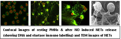 NOX-2 activity by facilitating the migration of p47phox to the neutrophil membranes, and interaction of NO with MPO generate nitrogen dioxide (.NO2) and nitryl chloride (NO2Cl). NO also mediated release of neutrophil extracellular traps (NETs) which was regulated by ERK and MAP kinase signaling. These findings have direct implications in medical science and suggest the role of NO in innate immunity as an important modulator of neutrophil functions.