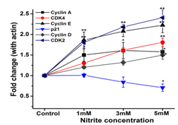 Studies on promyelocytic HL-60 cells in this lab systematically explored the effect of NO donor (DETA-NO) and nitrite on the cell cycle. NO in lower concentrations had proliferative effect, while cells treated with higher concentrations exhibited cytostasis, apoptosis, mitochondrial membrane potential loss, caspase-3 activation and dUTP nick end labelling. The proliferative effect of NO was redox sensitive and augmented expression of various cell cycle regulators such as Cdk2, cyclin B, cyclin E, which was blocked by roscovitine, a Cdk2 inhibitor. S-Nitrosylation of Cdk2 and an increase in the Cdk2 associated kinase activity was observed for the first time in NO/nitrite treated cells.