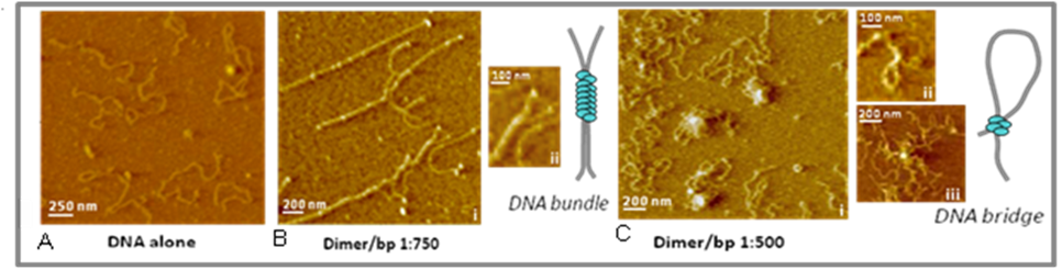 Figure: AFM images of PfHUp- DNA complexes with increasing dimer/bp ratio. (A) DNA in the absence of protein. (B) Dimer/bp ratio of 1:750. Stiffened DNA strands (panel i) as well as DNA bundles (panel ii) are shown. (C) Dimer/bp ratio of 1:500. Formation of complexes with a small number of foci and extruding DNA loops (panel i), a DNA bridge resulting in DNA looping (panel ii) and a nucleoprotein complex with a single focus (panel iii) are seen.