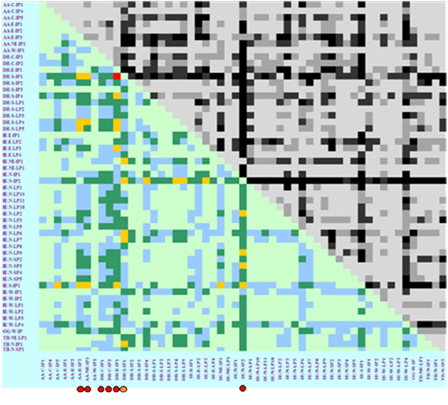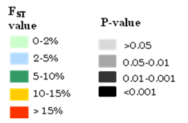 Figure: Frequency distribution of a TNF-α enhancer SNP in India and Pairwise FST analysis to study genetic differentiation among Indian populations (IGVC panel) using frequency data of SNPs previously associated with falciparum malaria. |